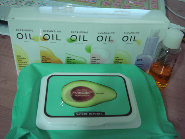(1)在免税店买的植村秀的卸妆油,每种都有了,每种50ML,很不错(2)RAIN代言的一个牌子,韩国的,卸妆湿巾,我一般先用湿巾卸掉,然后再用卸妆油卸,然后再用洗面奶洗干净,我是个没安全盖的人,这样三次卸的话会很干净了的