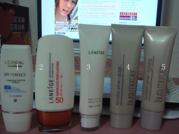 (1)欧莱雅的防晒霜,SP50的,女人我最大介绍才买的,用着一般,就是太油(2)兰芝的防晒霜,买了好久了一直没这么用(3)兰芝的控油的,都没这么用过,买了好久了(4)laura mercier的妆前乳,很好用,是控油的,适合夏天用(5)是适合冬天用的,高保湿,妆前乳
