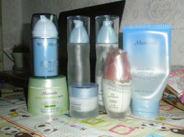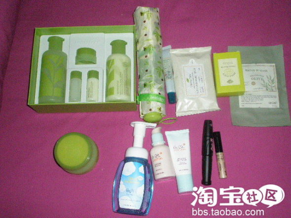上面一排分别是悦诗风吟的绿茶套盒,用了一天,超级喜欢,比梦妆更适合我的皮肤,旁边是悦诗风吟官网赠送的伞,那个小小的是悦诗风吟的薄荷缩毛孔精华,他旁边是赠送的悦家的湿巾纸和苹果洁面小样以及一张橄榄面膜。第二排从左到右分别是悦家的绿茶睡眠面膜,还没用呢,然后是爱丽的卸妆摩丝,已经用了很喜欢,他的旁边是爱丽的DR.OIL系列的BB霜和妆前乳,今天早上已经用过,控油确实不错,喜欢