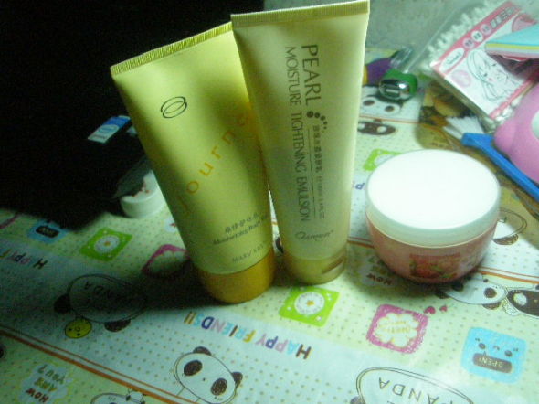 最后一组是:玫琳凯的身体乳,这个是我老妈的,她不习惯用,说是擦在身上太滑了,我也没用,放着呢;旁边的是欧诗漫的身体乳,老妈买护肤的时候送的,也没用,都不习惯擦身体乳;最后一个是雅芳的新生滋养霜100克(红瓶),这个也是送的,呵呵,可惜不适合我,也不适合老妈,放着了