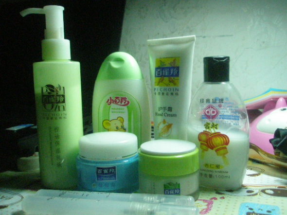 我是一个超级跟风的人,有人说国货好,我就一时败了大堆国货,图片上的是我还没用完处于闲置中的,并 不是不好,只是个人跟倾向于使用梦妆。呵呵,来介绍一下:百雀羚控油保湿乳液,适合油性怕长痘的皮肤,百雀羚24小时保湿霜,有点大宝的味道,百雀羚无暇透白紧致眼霜,这个还是非常不错的,后面一排是小百羚的芦荟润肤乳,小朋友用的;他的旁边是百雀羚的护手霜,很滋润,然后是宫灯杏仁蜜,很轻薄,容易吸收;最后还有两支霞飞的香水,我比较喜欢,便宜,携带方便,而且味道是我想要的,只是留香不持久(两支都用光了,舍不得丢,呵呵),这些国货现在都闲置了,本来想便宜处理的,可惜没人要,只有自己留着了