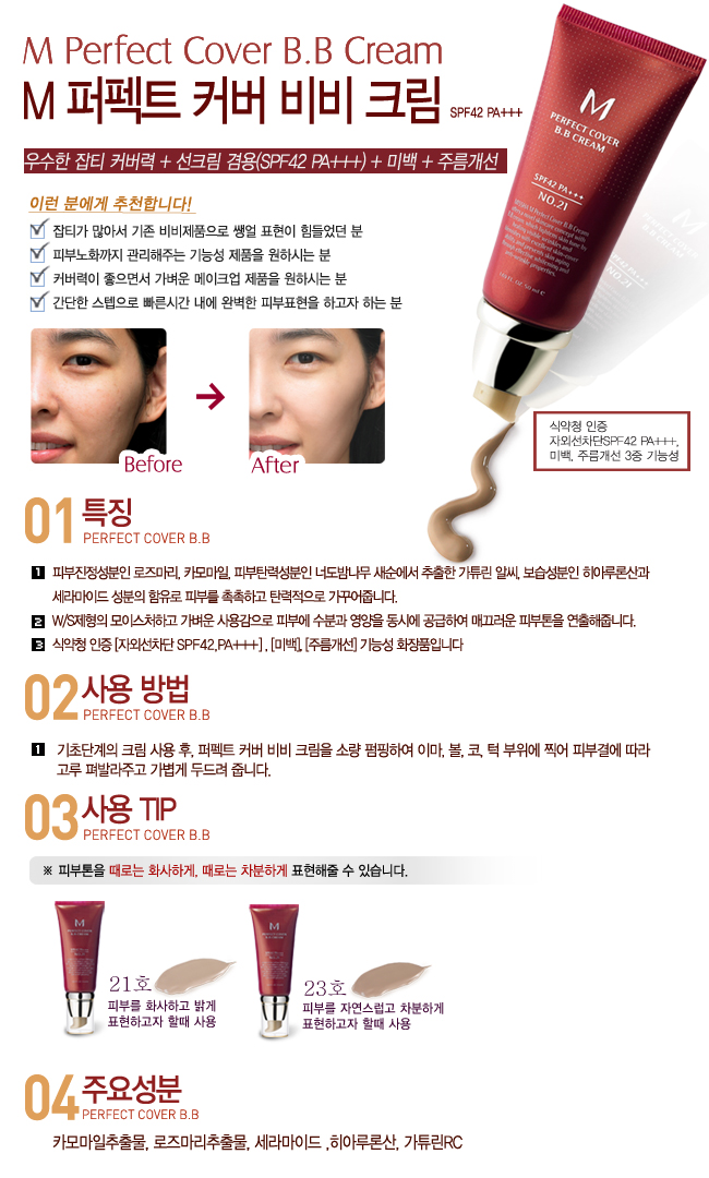 效果不用说了,官网的效果图在这里摆着!!!就是说明下它的防晒,这款BB霜的主要卖点就在此处,这款BB霜属于高端的产品,之所以高端是因为它的防晒指数高却没有厚重油腻感。 SPF42 PA+++让有的mm觉得指数超过30倍以上就会感觉皮肤很厚重,不透气,而且高倍数防晒霜怕会对皮肤造成负担,其实这一点完全没有必要担心,韩国的这些经典品牌在防晒上已经做到相当的程度了,他们特别注重防晒,防晒50倍的也比比皆是。 另外有的mm担心防晒作的好的话,因为又要做的清爽无油可能就会在遮瑕力上打折扣, 但这款目前热卖的MISSHA新出这款红色包装的BB霜却是既做到高倍防晒又做到遮盖力好无厚重油腻感!这款BB的另一个卖点就是它对于肤色的修正,皮肤吸收之后是白里透红型,特别适合肌肤缺少血色的MM,店主人亲身试用,都不用涂腮红,自然水嫩得一如青春美少女(人家指的皮肤啦)