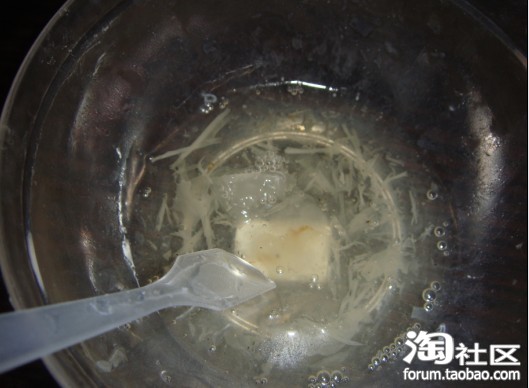 取一颗面膜纸泡开,因为银耳汁比较浓,所以量要倒多点,才好泡开。