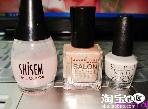 用到的三瓶指甲油第一瓶是底油...第二瓶是美宝莲的玫瑰金属色指甲油(原本是买来夏天搽脚趾甲的O(∩_∩)O~)第三瓶是白色的