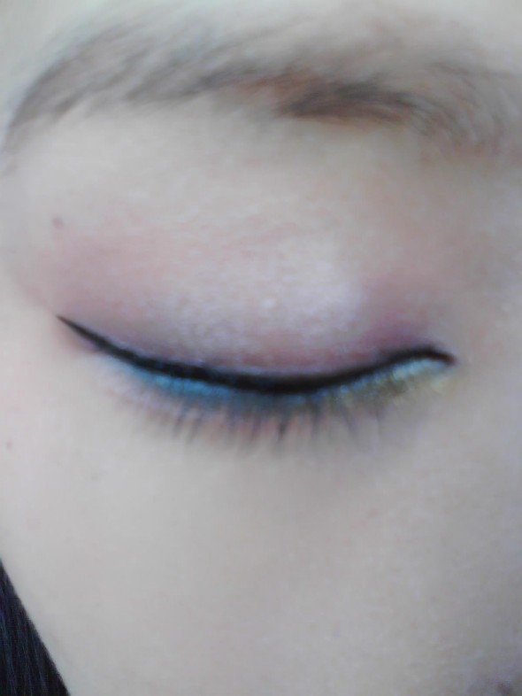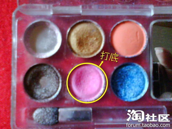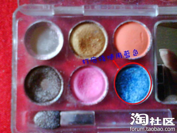 粉色打底后,选择蓝色眼影上在眼窝部位,在睫毛根部加深一些,在下眼睑的外侧也稍加晕染,使下眼线过渡更自然[如下图所示]