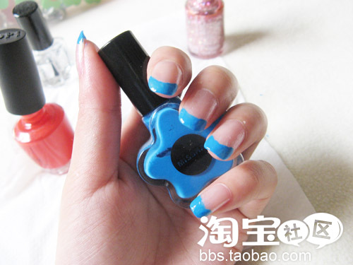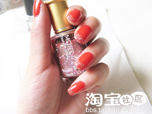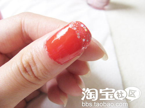 然后用带亮片的涂在指甲的前端,大小宽度可以根据自己的喜好来定哦