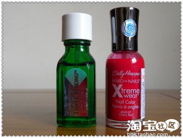 目前的新宠,美国原装进口的sally hansen.喜欢这样专业的牌子,各种用品一应俱全。可以用便宜的指甲油但一定要用好的护甲产品,左边的三重加固护甲啫喱就非常适合我,先刷一层再涂颜色,等干掉之而后颜色外再加一层,不但保持时间长,卸除也容易,自从我用它,指甲几乎没有变黄。右边是加固营养彩色甲油,哈哈,屈臣氏特价29元买的,殷桃大红色,超正的红,漂亮的一塌糊涂,好像已经下市了,上次去看到的全是100多一瓶的。