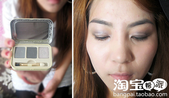接下来就是我们说的小烟熏眼影了!这款SKIN FOOD的三色眼影,我们家很多会员开始使用了!也是双双的最爱!一盒中的三个色搭配的很好,比较适合新手的MM呢~哈哈,其实双双本身就是双眼皮,但为了让眼妆更漂亮,就贴了双眼皮胶了~这张照片看到双眼皮胶了~