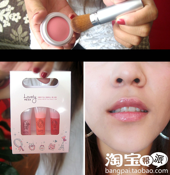 MISSHA的腮红颜色很饱满,THE FACE SHOP的唇彩套装一共是三个色,可以混着来用的~随心情可以调换颜色,今天用的是稍深粉些的~