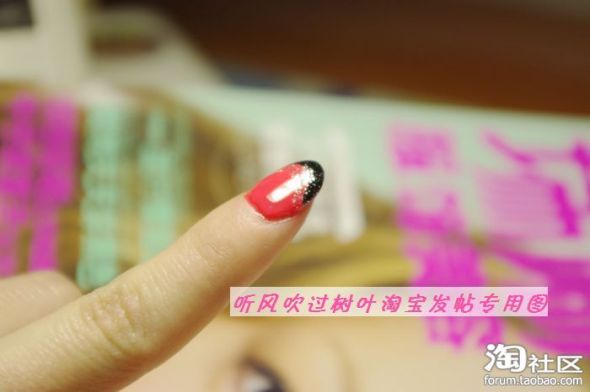 第四步:涂上银色闪亮指甲油,覆盖整个黑色和部分红色,也可以只涂黑色部分,或者黑红交界的部分哦,这个可以大家自由发挥