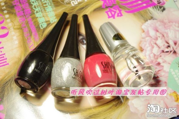 这个是我要用的几瓶指甲油,很简单吧,3瓶SHISEM尖瓶指甲油,色号分别是506,100,M59,和1瓶护甲底油