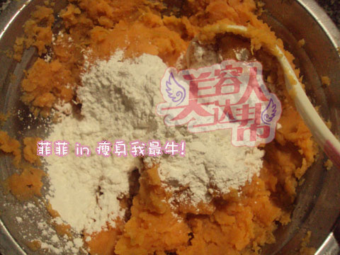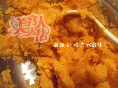 1.將番薯削皮切小塊,然後隔水蒸熟~然後用湯匙壓成蓉.
