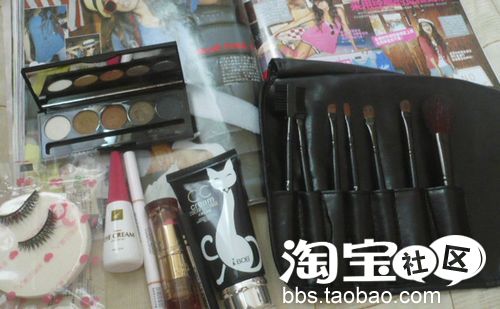 1.CC霜 2.永和3美人粉扑 3.胶水 4.小熊粉色唇膏 5.蒙巴拉遮瑕笔 6.BOB的眼影盘 7.套刷 8,漏掉了泊美的隔离霜和欧蒙的眼线笔噢。