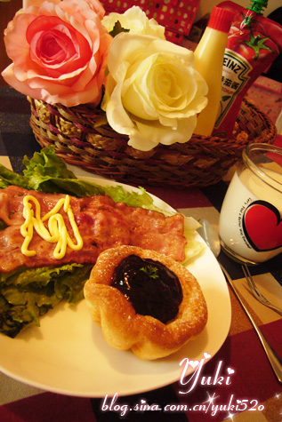 早餐:牛奶 蓝莓面包 两片培根 丘比沙拉酱