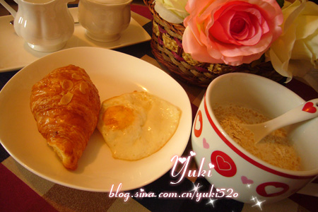 谷物早餐:牛角面包,煎蛋,牛奶&燕麦片