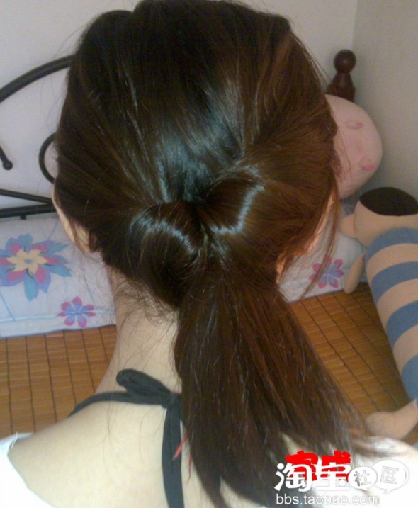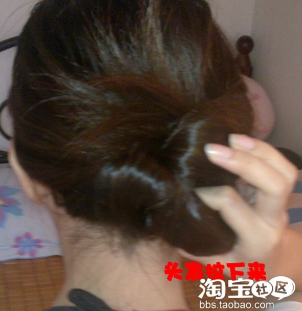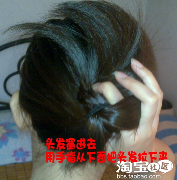 然后中间分开一点 弄一个洞 用手指把全部头发从上面拉下去
