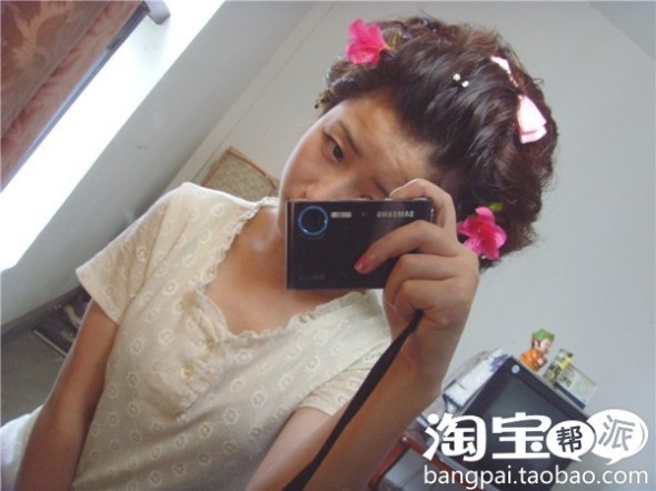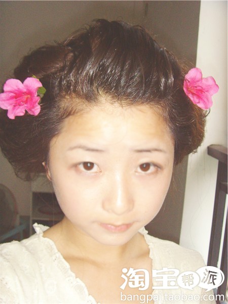 插上两朵小花 平时不代发饰 所以没有发饰 去摘了两朵杜鹃花 哈哈 姐妹们可以带点发饰哦 这样会更气派了
