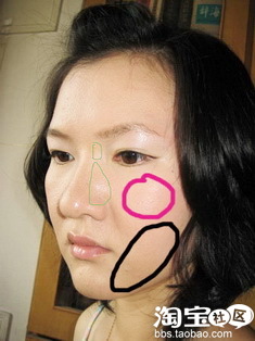 充分利用粉饼深浅不一的色号,来打造一下小脸吧~~黑色画圈的区域用最深的6号粉饼,也就是健康小麦色刷均匀,粉色的位置涂上腮红,绿色的位置用4好粉饼,可以打造立体的鼻子哦~~~