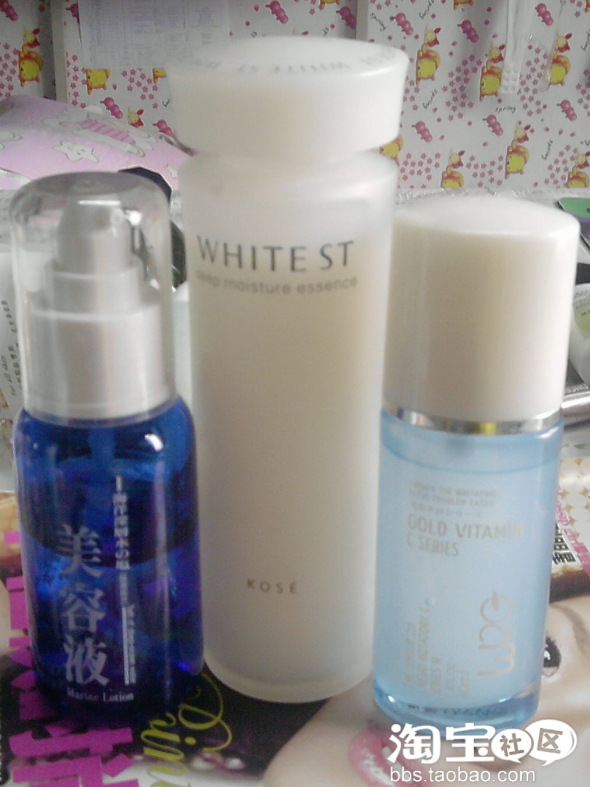 中间的高丝家的保湿精华液(110米):是水乳合一型的选手,就是只用它就OK了,保湿真的很强大,冬天只用它都不会干,冬季最爱~~