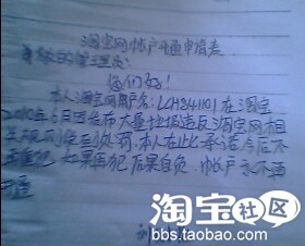 本人淘宝用户名:lch841101在淘宝2010年6月因发布大量违反淘宝相关规则受到处罚,本人在此承诺今后不再重犯,如果再犯,后果自负,帐户永不再开通。