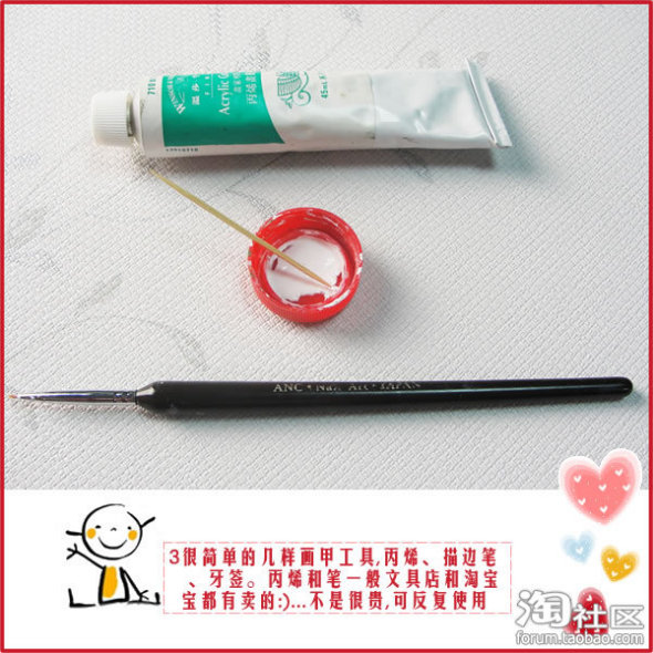 (白色丙烯、普通描边笔、矿泉水瓶盖、普通牙签、)白姐姐用的都是些很普通的工具哦!丙烯和描边比在一般的文具店就可以很容易找到啦,而且价格也不贵的说。瓶盖和牙签就更常见了哈~~~