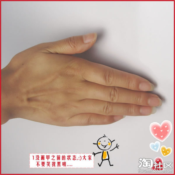 爱美之心人皆有之!俗话说的好:“只有懒女人没有丑女人”。于是象米兰这样没有先天优势的妞儿,总是致力于让自己做一个细致的气质美女。说到细致,那就要从小小的细节着手啦!米兰今天想balabala美甲哦~~~手是女人的第二张脸哦!于是手部的保养的和美容都是咱们所关注的。而恰恰米兰就是属于那种手掌大指头粗的手(遗传自有着漂亮脸蛋的妈妈的肥手手,泪奔~~~)不过好在指甲比较方正狭长(米兰觉得这样的面积比较大会比较有发挥余地哈,偷笑)。接下来大家就看看米兰没有动工前的手手吧(放上来是想让大家对美甲DIY要充满信心哦!PS:这么差的原材料加工后都还满不错的,偶的动手加工下应该会非常的十分的漂亮,那么跟着白姐姐的手法来学简单的美甲DIY吧!哈哈~~~给米兰留点薄面,不要笑话偶的手手丑呀!!!拜托拜托)