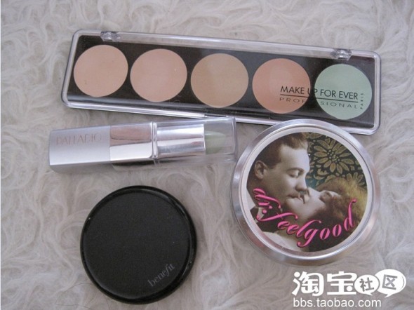 绿色遮瑕(网购):我皮肤会泛红,所以很多绿色调色的东西,这个有点干,质地有点厚