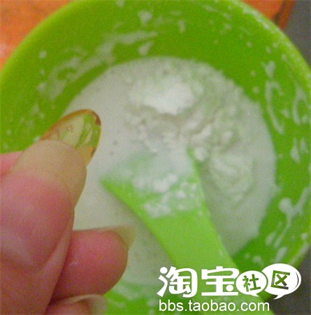 加入一粒维生素E 加水搅拌 可以用牛奶 矿泉水 蜂蜜