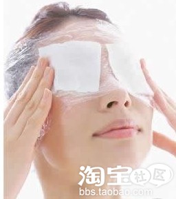 6、将用温水浸湿过的化妆棉敷上眼睛,再用保鲜膜覆上两三分钟。因为蒸汽的作用,眼霜被充分的吸收。