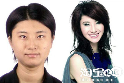 妆容点评: 左边照片里的李湘油光满面,感觉很平庸,比较俗气。但是把底妆 调白了,在腮边打上阴影后,眼妆边变浓厚了显得眼睛很大,从而明显脸变瘦了,感觉年轻了、美丽了,简直就是大变身,成为精致美女。