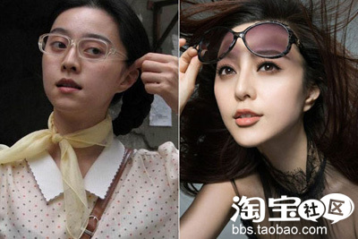 妆容点评: 哇,这真的是大美女范冰冰吗?大大的脸蛋,架上一副透明框眼镜,显得精神不振、苍老感十足。但是右边的照片像变了个人,瓜子脸孔衬托出精致的五官,实在让人心动。其实在笑肌附近和下巴位置打上一点点高光也是瘦脸 的好方法哦。