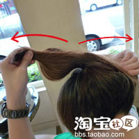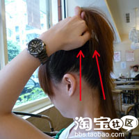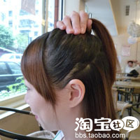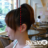 3.全部头发往上抓后用橡皮筋绑起,固定的高度从侧面看应该跟耳朵成一直线才够高。