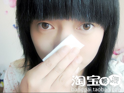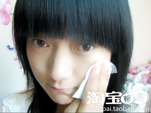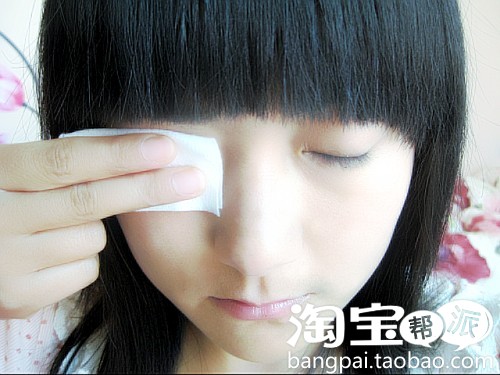 第四步:祛眼影时可将整张棉片覆于眼皮,在眼部轻按3秒,让眼妆充分地溶解,然后按照眼皮的纹理,右眼顺时针,左眼逆时针的方向清洁。