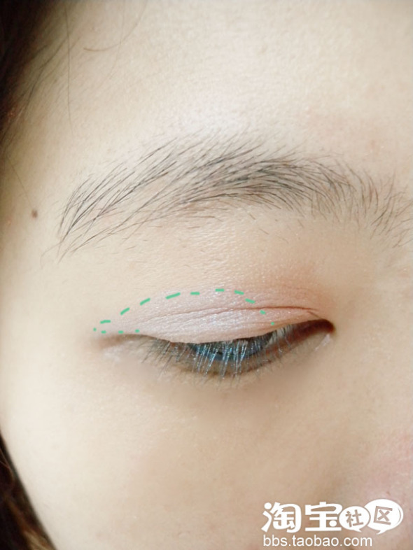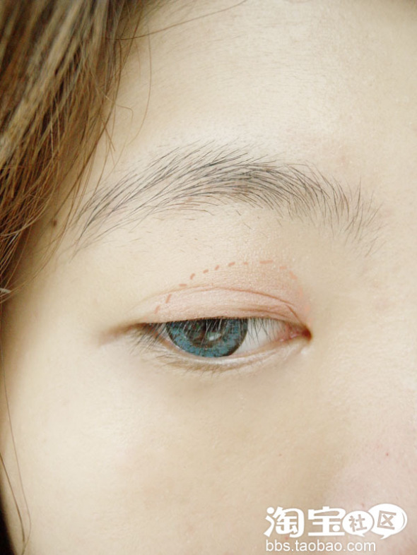 下面看虚线位置,双眼皮线内,可以超一点点,看自己眼皮的厚度,Yika眼皮很厚很多肉,所以多画出来一点也可以哦~单眼皮和内双的MM就要注意面积切勿过大哦~!!