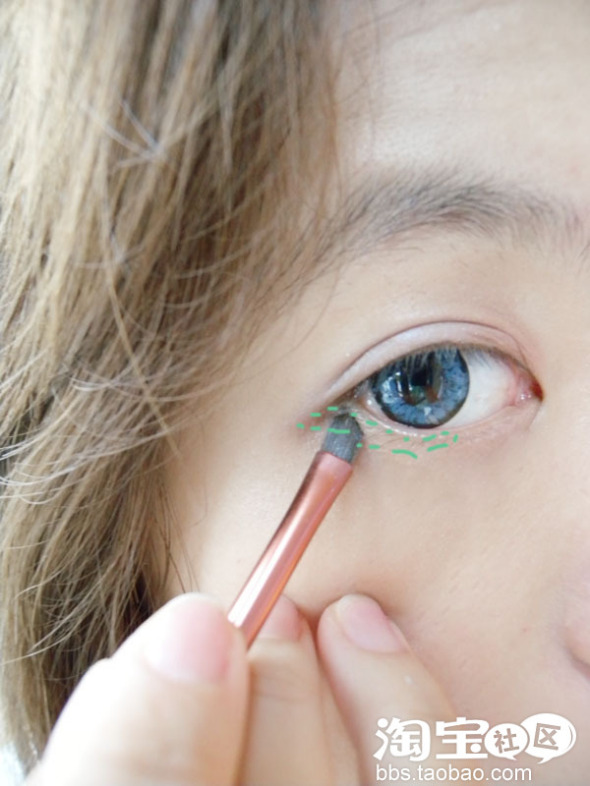然后用刷子,在绿色虚线位置打灰绿的眼影,,这里推荐用平刷头的刷子哦,因为要打的比较细腻匀称,而且形状也比较适合用刷子,用手指很难打的好~