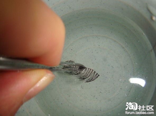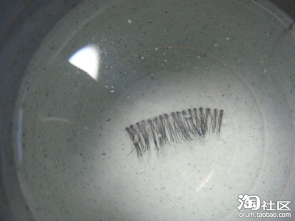 3~5分钟后,用镊子夹住睫毛,在水里晃几下,这个时候睫毛上的睫毛膏和胶都基本上飘在了水里哦!!