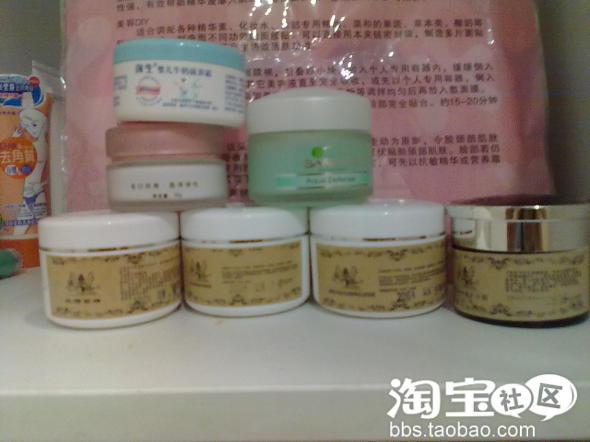 下面的从左到右三个白色瓶子的是:红洒面膜、乳木果油晚霜、蛋白日霜、