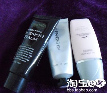 左起,露韩饰BB霜,很好用,第三瓶了。菲诗小铺紫隔,美妍粉色粉底液,质地很薄。