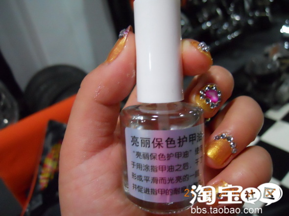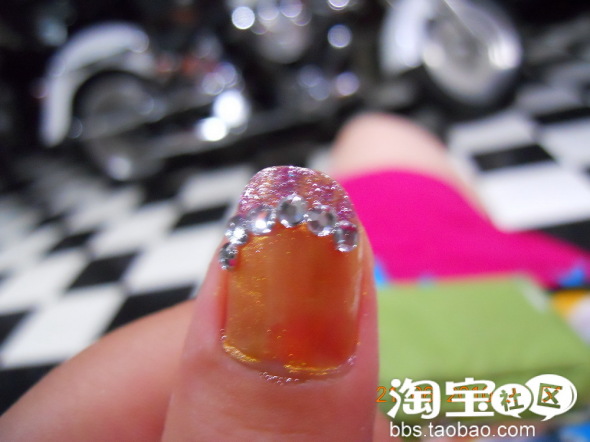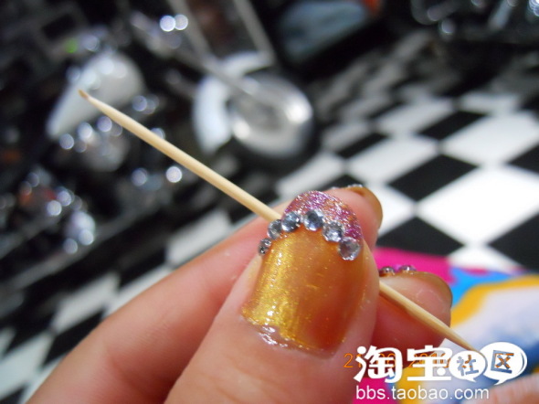 5刷一遍亮甲油(不要太薄,不然钻粘不牢靠!!)用小牙签,蘸点水,然后点钻,钻可以挂在牙签上哦!
