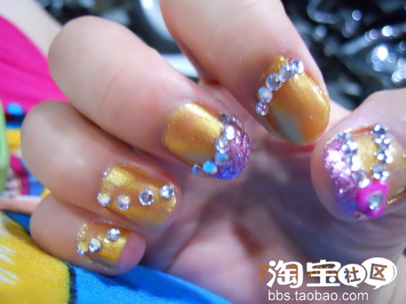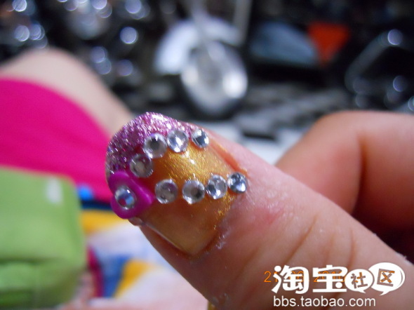 6在自己喜欢的地方点钻,注意,刷甲油是粘好一个手指的钻再刷另一个指头的甲油