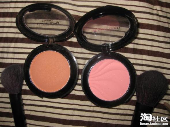 胭脂我用的是2色,用的刷子也不一样,橙色的胭脂是面部V字那里扫2边,粉色的,对这镜子微笑,扫上去。