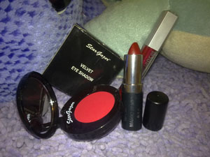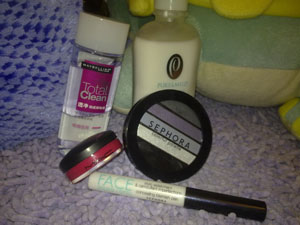 美寶蓮卸妝水、泊美的化妝水、絲芙蘭四色眼影、MAC的唇彩、絲芙蘭遮瑕筆。