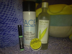 絲芙蘭卸妝乳、The face shop爽膚水、The body shop急救棒、小蜜緹潤唇膏。