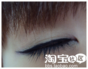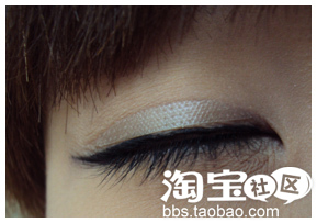 现在画眼线,沿着睫毛的根部画到眼尾稍微拉长点,可以有放大眼镜的效果哟。这里甜心建议MM用眼线膏,会比较有立体的感觉。