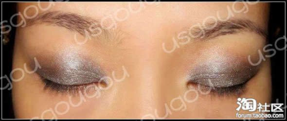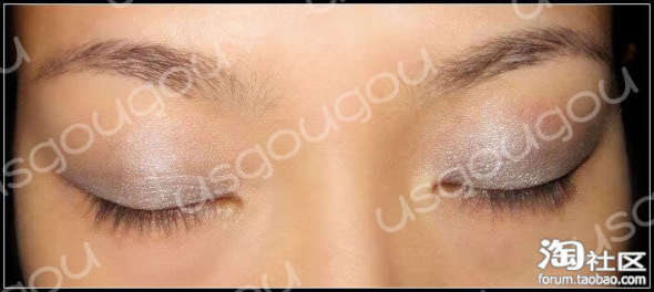 这里我用的是眼影粉打底,可以用刷子,也可以用指腹蘸取少量眼影粉轻轻往眼皮按压上去(记得是按压哦)。粉的优点在于,它很好上色,而且颜色饱满,比较闪,最主要的是它不象一般眼影画出来的分界那么明显,也就是说,它的边缘可以很自然的和周边融合,所以,用粉画出来的眼妆即使没有很高超的技术,也可以感觉很自然。尤其对于烟熏妆而言,粉的自然过渡的优点体现的尤其明显。