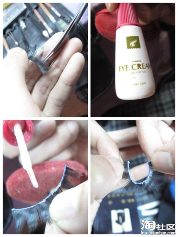 注意:比眼部长度长出2--3毫米最美丽。小心翼翼将胶水涂抹在假睫毛的根部。注意:根部两面都要涂上胶水。