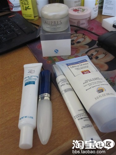从左至右是ZA隔离,欧莱雅眼睫毛增长液,欧莱雅美白精华,露得清的物理防晒。