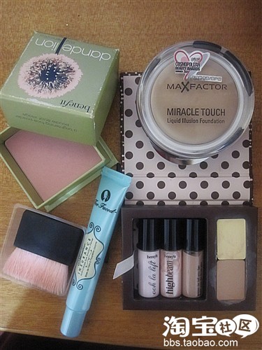 下面是一些道具啦,MAX的粉霜,我拿来涂两颊斑点,遮得住而且保湿。benefit蒲公英散粉,由于我的散粉还在快递来的路上,所以用它也行,我平时也会用来做腮红,它做散粉也不会红,淡淡的就很漂亮。