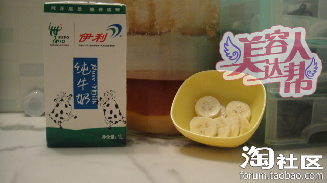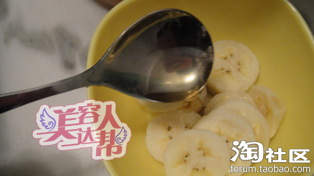 今天的主角登场,分别是是香蕉、蜂蜜+牛奶,功效是补水抗过敏面膜:sumile没有面膜碗,就找个小碗代替了哈