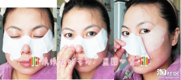 看看,很别致吧,像口罩一样的挂住,然后从下巴提拉上去两片面膜,仍然是挂在